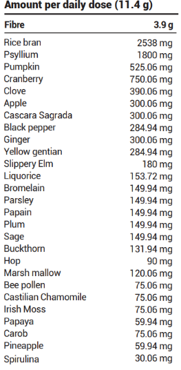 Rijst (Oryza sativa) zemelen, stabilisator (hydroxypropylmethylcellulose), psyllium (Plantago ovata) schilpoeder, cranberry (Vaccinium macrocarpon) fruitpoeder, pompoen (Cucurbita pepo) zaadpoeder, kruidnagel (Syzygium aromaticum) bloempoeder, Appel (Malus domestica) fruitpoeder, cascara sagrada (Rhamnus purshiana) bastpoeder, gember (Zingiber officinale) wortelpoeder, zwarte peper (Piper nigrum) bessenpoeder, gentiaan (Gentiana lutea L.) wortelpoeder, gladde iep (Ulmus rubra Muhl.) bastpoeder, zoethout (Glycyrrhiza glabra L.) wortelpoeder, bromelaïne, papaïne, peterselie (Petroselinum crispum mill.) bladpoeder, pruim (Prunus domesticus) fruitpoeder, salie (Salvia officinalis L.) bladpoeder, duindoorn (Rhamnus frangula) schorsextract, magnesiumstearaat, marshmallow (Althaea officinalis L.) wortelpoeder, hop (Humulus lupulus L.) bloempoeder, bijenpollen, kamille (Matricaria recutita L.) bloempoeder, Iers mos (Chondrus crispus) hele plantenpoeder, sprinkhaan (Ceratonia siliqua ) bonenpoeder, x anthangom, papaja (Carica papaya L.) fruitpoeder, ananas (Ananas comosus) fruitextract en spirulina (Arthrospira platensis).